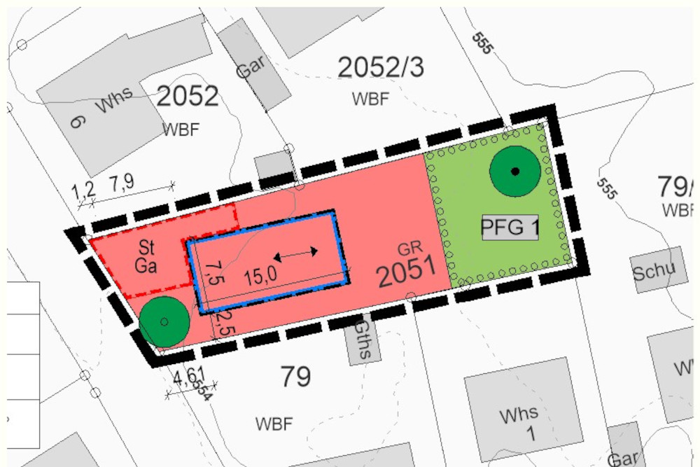 Das Flurstück liegt innerhalb eines im Zusammenhang bebauten Ortsteils und ist bereits vollständig erschlossen, d.h. normalerweise gäbe es nach § 34 BauGB Baurecht. Allerdings steht dem ein bereits über 60 Jahre alter Baulinienplan entgegen, der hier eine Bauverbotszone festsetzt.