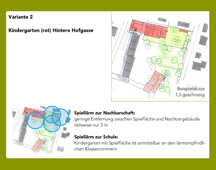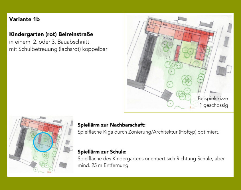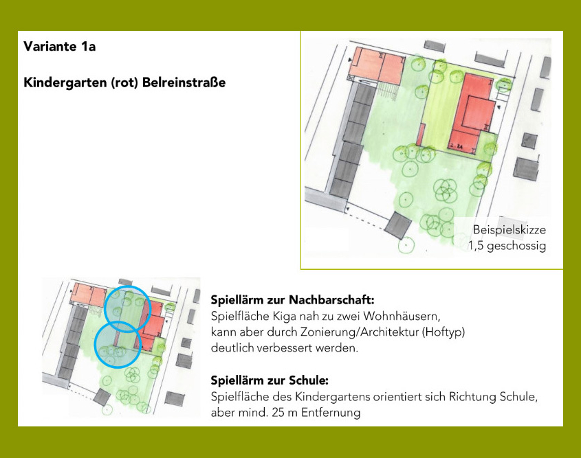 Die Machbarkeitsstudie hat gezeigt, dass ein Kindergartenstandort an der Belreinstraße im Vergleich mit der Hinteren Hofstraße große Vorteile in Bezug auf Kfz-Erschließung, Lieferverkehr, Straßenbreite, Verkehrssicherheit und Schallschutz bringt. Außerdem werden dadurch zwei ideale Optionen für zukünftige Schulerweiterungen freigehalten.